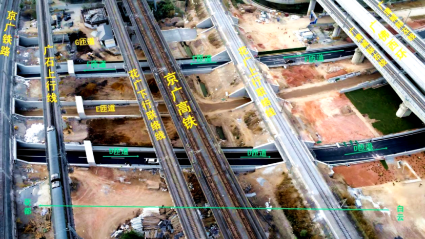 施工难度堪称空前。该路段需在有限的空间内,以框架涵下穿的方式,连续穿越广清城际、京广高铁、京广普铁等共12条铁路线路。这些线路承担着繁重的运输任务,特别是京广线属于全天候运营,施工只能在极短的铁路“天窗期”内进行。建设者们也面临巨大风险挑战,地下地质条件复杂,地面安全风险极高,大型机械难以展开作业,大量工序依靠人力完成。