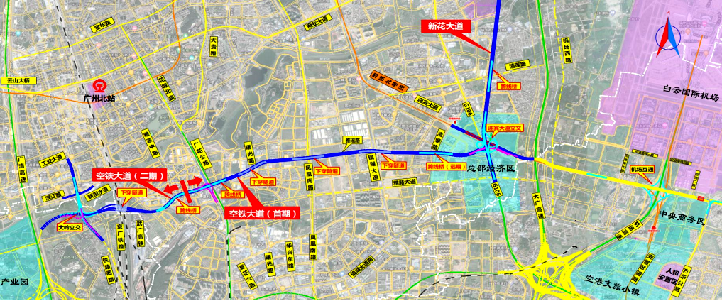 正在收尾的二期工程则起于新街大道,终于广花公路,全长约3.4公里,包含立交桥、跨线桥及涉铁下穿隧道建设。二期工程进一步明确了其“空铁联运”的核心使命,直指打通连接广州北站的“最后一公里”。